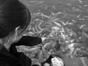 昨天上午,李女士到了绣山公园时,看到很多人带着不同的食物喂鱼,有的用面包、油条,有的用橘皮、糖块等。李女士顺着鱼池转一圈,看到鱼池内浮起了好几条死鱼,大的有一二斤重呢。