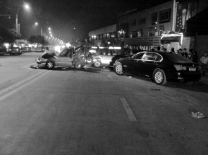 据目击者、酒吧旁边小卖部的店主王女士说:“当时我正在店内,那些出租车在我店门口停成一排。大约1点多的时候,突然听到几声撞车的声音,我出去一看,发现一辆宝马撞到了路边的出租车。幸亏当时出租车司机都不在车里,不然可能要出人命。”