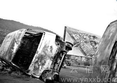 在一面土地规划的大型广告牌下,前日冲突时烧毁的汽车触目惊心。本报记者 杨观 摄