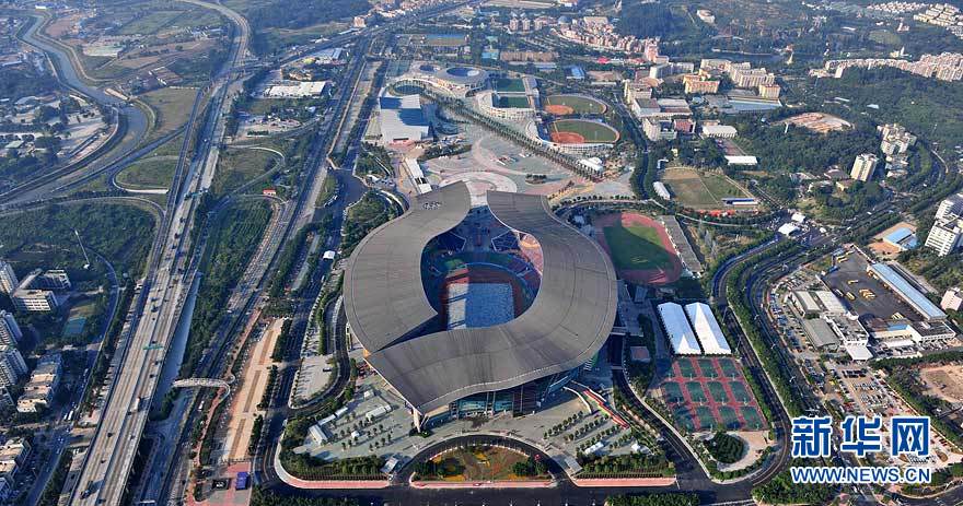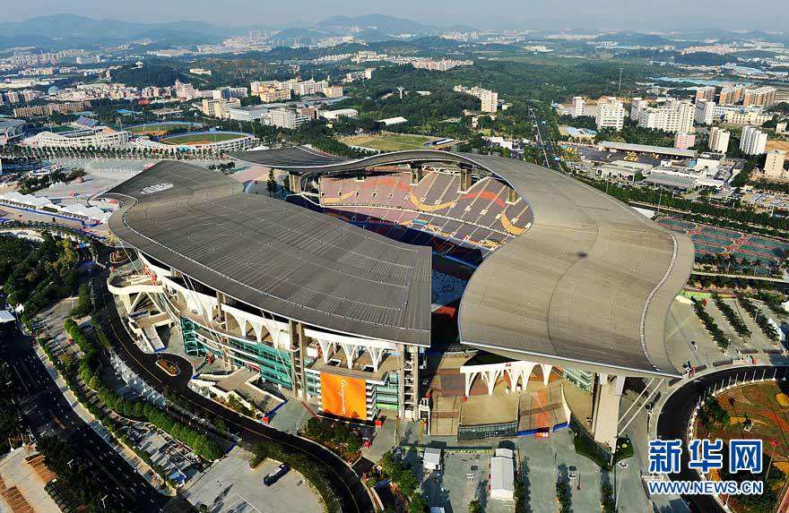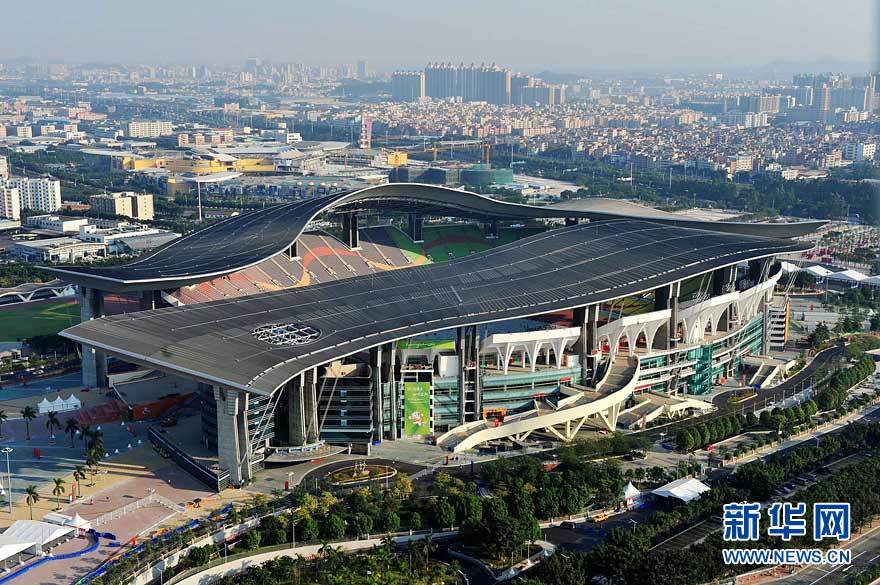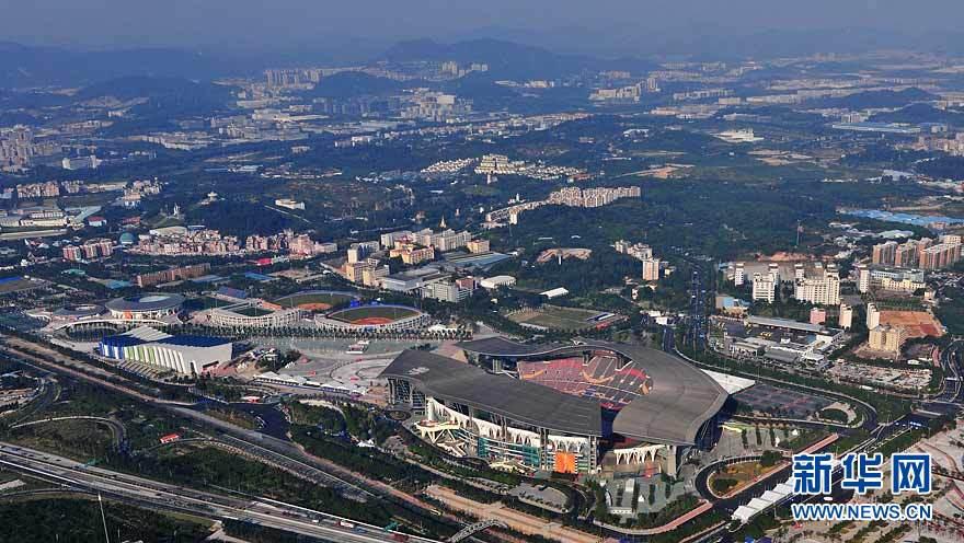 图为航拍的广东奥体中心场馆群(摄于10月29日)。在广州亚运会期间,广东奥林匹克体育中心场馆群将举行田径、游泳、射击、网球、棒球等项目的比赛。刘大伟 摄 图片来源:新华网
