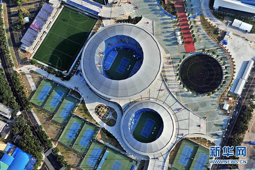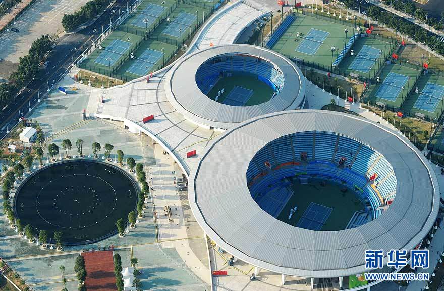 图为航拍的广东奥体中心网球馆(摄于10月29日)。在广州亚运会期间,广东奥林匹克体育中心场馆群将举行田径、游泳、射击、网球、棒球等项目的比赛。刘大伟 摄 图片来源:新华网