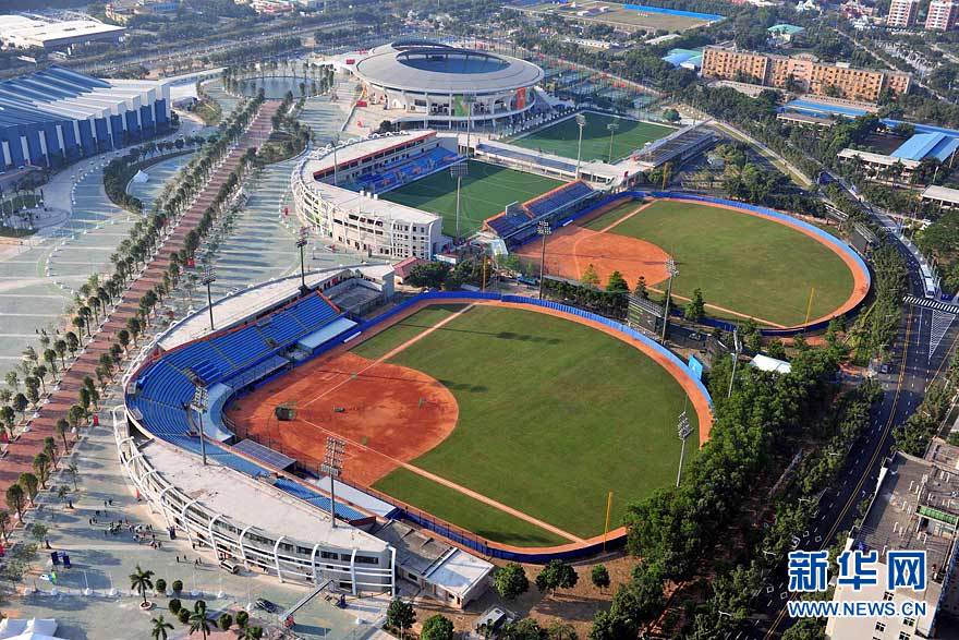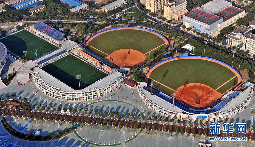图为航拍的广东奥体中心棒球场和曲棍球场(摄于10月29日)。在广州亚运会期间,广东奥林匹克体育中心场馆群将举行田径、游泳、射击、网球、棒球等项目的比赛。刘大伟 摄 图片来源:新华网