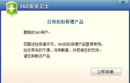 360今早对用户弹窗通知称,360宣布召回扣扣保镖产品,其在弹窗中写道:因需送检申请许可,360扣扣保镖产品暂停使用,给您带来的不便,深感歉意,并感谢您的支持,请您卸载该产品。