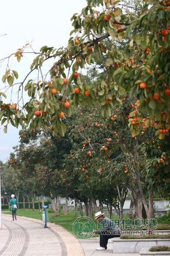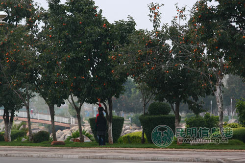 11月3日下午4点,玉溪市聂耳文化广场。天有些冷,街上行人稀疏,园林工人正忙着在柿子树的树干上涂抹石灰水,说是为了防虫防冻。广场的任何一块草地上,都有柿子树的身影。河滨大道的两边,柿子树更被栽成行道树,绵延数公里,一眼望不到尽头。11月正值柿子成熟之时,大大小小的柿子挂在枝头,沉甸甸的,一路看去满眼金黄,诱人无限。柿子就挂在行人的头顶上,有些挂得比行人的头顶还要低,很多人一路走过,都会忍不住伸一伸手,作势要摘,但大多数人都控制住自己,只有很少的人下了手,之后一路飞奔,迅速逃离〈守柿子的保安人员和绿化工作人员骑着电动自行车来回巡逻,随时充满了警惕。一旦有人偷摘柿子,至少也要挨一顿“批评教育”。2009年,还有人因为偷摘柿子被拘。