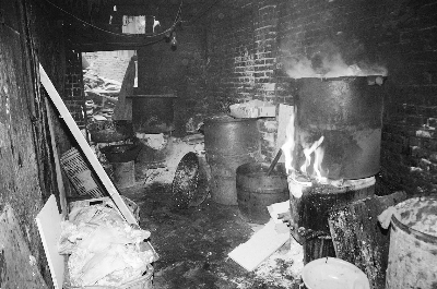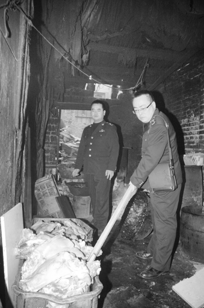 屋门口架着火炉,火上正用半截废旧油桶煮着生肉。而与火炉仅一门板之隔,外面就堆放着许多用来烧火的木柴和纸箱,很容易引发火灾。检查中,执法人员发现该窝点竟然用涂抹沥青的方式来“拔毛”。经过执法人员的仔细检查,在简易房旁边的一间黑屋子内找出了躲藏在内的老板,而这位老板现场拿不出任何的合法证照。“这些加工好的熟食都销售到哪里去?”“绿色市场。”“不可能,绿色市场就不卖熟食品。”工商人员当即拆穿了加工者的谎言。最后,工商执法人员在这处熟食加工黑窝点查获待加工的生肉500余斤、已加工好的熟食300多斤。