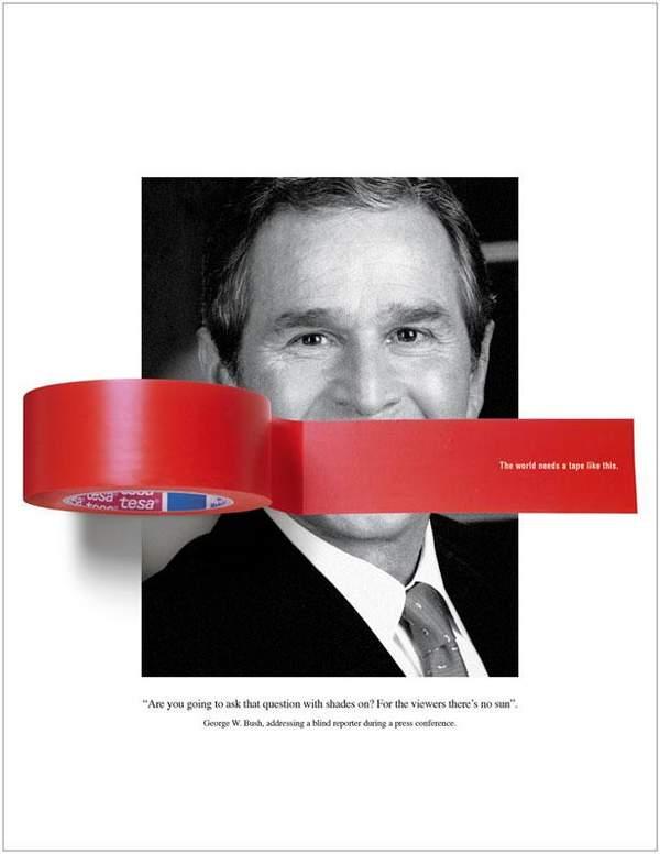 德莎胶带:布什广告词:世界需要这样的胶带。(布什引语:“你是准备戴着墨镜提问么?对读者而言,这暗无天日。”——在记者招待会上回答一位盲人记者)