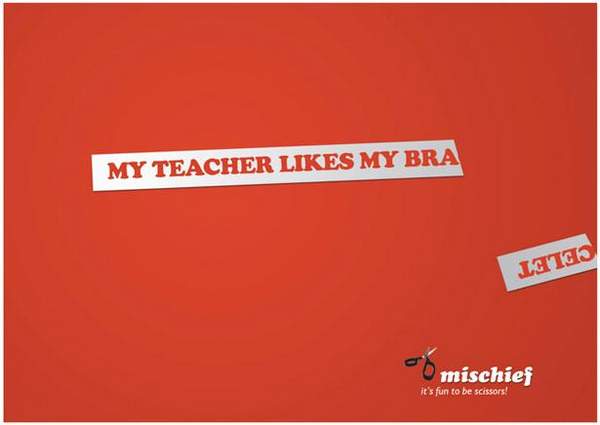 Mischief剪刀(图解:本来是“我老师喜欢我的手镯”,剪掉一截后,变成了“我老师喜欢我的胸罩”。)