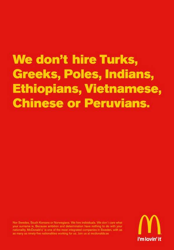 麦当劳:个人招聘 广告词(大字):我们不雇用土耳其人、希腊人、波兰人、印度人、埃塞俄比亚人、越南人、中国人和秘鲁人。(小字):也不要瑞典人、韩国人和挪威人。我们雇用个人。我们不关心你姓什么。因为雄心和决心与你的国籍无关。