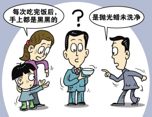 昨天下午,老师伯又找到销售这批不锈钢碗的商家。经营部负责人傅先生说,不锈钢碗上附着的是一层黑色的抛光蜡,碗具在使用前要用洗洁精将这层蜡洗掉再使用。手被碗染黑,可能是因为碗上的抛光蜡未清洗干净,多洗几次这蜡就会去掉。