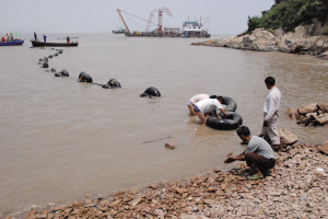 目前温州主要有两条3.5万伏和两条1万伏的海底电缆,其中两条3.5万伏的海缆是把电输送到洞头。七洞线是从乐清七里港到洞头的,这是1987年我市开始铺设的第一条海底电缆,从乐清的岐头山过海到大门岛,然后再到洞头。1999年,从龙湾永强铺设了一条到洞头的海底电缆洞头线,它是温州目前最长的海底电缆,长约14.5公里,相当于从新城到温州机场的距离,这是一根电缆直接通到底,中间没有任何中断与停顿。而两条1万伏的海缆主要是大门岛到鹿西岛。