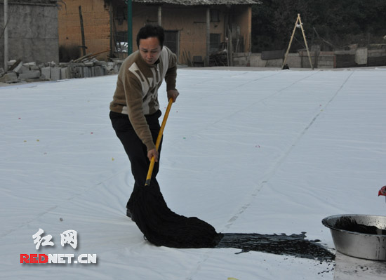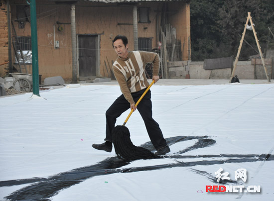 徐双喜介绍说,这个“拖把毛笔”是用9个全棉拖把做成,而墨水是用12瓶墨汁,再加3公斤水调兑而成。而今年5月26日,他曾在北京写下的272.25平方米草书“龙”字被称为“世界第一龙”,被称艺术界称为“中国榜书第一人”。