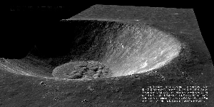 直径约9千米,深约1.7千米。图像分辨率约1.4米,DEM空间分辨率约4米。本图使用嫦娥二号CCD立体相机在距离月面约20千米轨道上获得的影像数据,结合两线阵摄影测量处理获得的数字高程模型(DEM)数据,经三维场景渲染后制作而成。