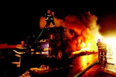 本报莱芜11月8日讯(闫秀玲于晓敏 石刚)7日深夜,一辆正在高速公路上行驶的大货车,莫明失火,满载的几十万元百货、五金、小型机械和一批出口物资被烧为灰烬。莱芜市公安局交警支队高速公路大队和消防支队官兵扑救了4个多小时,才将大火扑灭。