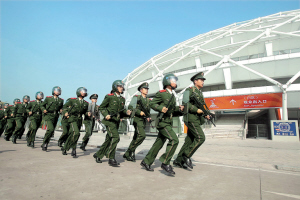 除此之外,记者还发现在珠江新城、天河等繁华地段,广州火车站、汽车站等交通枢纽地段,广园路、广从路等高速公路口处等不同地点都发现了武警执勤巡逻的身影。为确保亚运万无一失和开幕式的和谐平安,确保亚运期间的社会稳定,震慑打击犯罪,武警亚运安保执勤部队共抽组了大量兵力担负亚运会开闭幕式期间的城市武装巡逻任务,协助公安部门对城区主要出入口及公共交通枢纽实施安全检查,排查犯罪分子等。担负广州越秀区和天河区两个主要地区城市武装巡逻任务的武警广东总队惠州支队相关负责人介绍,他们每天都要出动近300名精兵强将和公安民警、联防队员等进行城市武装巡逻任务,每天24小时不间断巡逻。