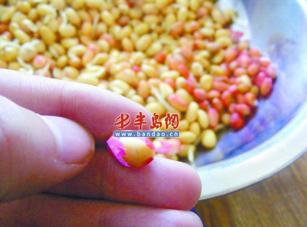 “这些豆子买的时间不短了,当时是在镇江路的菜市场花5块钱买的。买的时候就是想回家自己发点豆芽,这样吃着比较卫生。但是周四泡上后,周五又换了两遍水,周六就发现有的豆子变成红色的了。”随后郝先生拿出了发豆芽的菜盆,记者发现,里面大概三分之一的黄豆已经换上了红装,呈粉红色,并且红色分布得很不均匀。