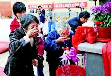 启用仪式上,小洼村的村民迫不及待地品尝从自来水管流出的甘