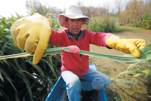小关邑村位于洱海的南面,离市区两三公里,村子的旁边就是洱海。今年以来,在靠近海边的柳树上、茭瓜和芦苇的叶子上,高出水面10厘米到1米的地方,密密麻麻地沾满了粉红色的福寿螺卵块。虽然福寿螺的卵块颜色和草莓一样鲜艳,但看到这么多的卵块,洱海周边的村民心里还是有些发毛。