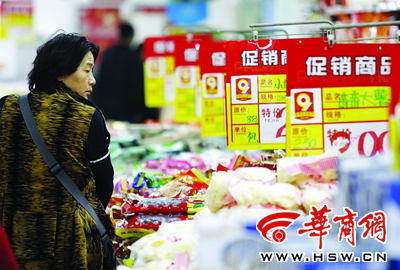 昨日,西安含光路一超市,顾客经过促销商品展台。据了解,为了增加销量,供货商和超市对某些商品进行降价促销,降幅达10%-30%本报记者 赵航 摄本报讯(记者张莉)“我坚持记账五六年了,而且我会用恩格尔系数来分析我们家的消费结构。”34岁的企业管理人员章先生说,他通过分析对比,认为他们家的生活质量下降了。