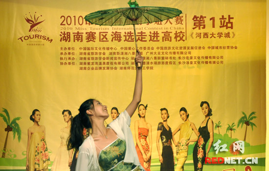 才艺展示红网长沙11月14日讯(记者 喻向阳 实习生 欧阳璐)今日上午,2010中国国际旅游小姐大赛湖南赛区的初赛在湖南师范大学拉开帷幕,来自省会十余所高校的首批百余名选手展开了角逐。