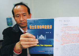 殷永林教授拿着自己的著作《独立以来的印度经济》,红笔划出为李天华“照搬”的著作的段落记者高伟/摄