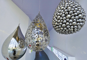 走入艺术展大厅,参观者如同戴上了超级显微镜,进入了一个神奇的纳米世界:一座不锈钢雕塑,取名《看不见的舞蹈》,它把纳米晶体的流动形式赋予了旋律、节奏与动感,美妙如一组圆舞曲,那舞动的曲线,正是在转换中的纳米粒子。一个灯光装置取名《演替》,它由8块圆形有机玻璃和导光软管组成视觉方阵,体现了生命形态结构的时空嬗变,它还证实这样一个道理:大到宇宙,小到细胞、纳米生命的演替,构筑成我们所感知的存在。