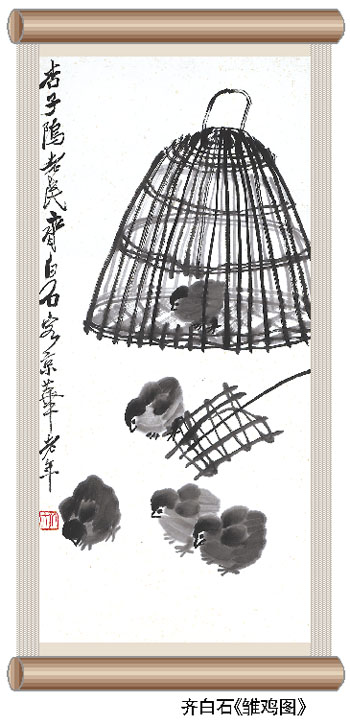 另外,像齐白石的佳作《雏鸡图》,表现一群雏鸡逃出笼外觅食的情景,充满浓郁的生活气息,画家巧妙地运用水墨效果,使雏鸡显得绒毛蓬松、活泼可爱,充分体现了齐白石水墨画作品“虽简而意到”的特色。