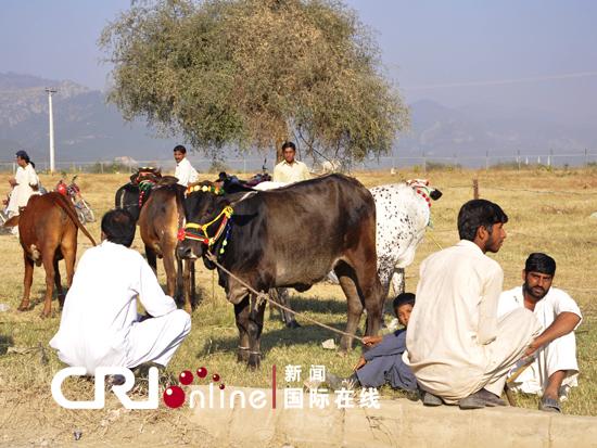 巴基斯坦人争先恐后秀自家的牛羊(记者王茜婷摄)