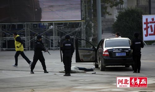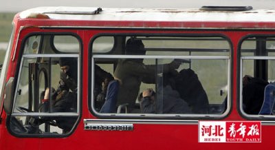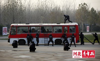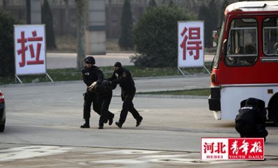 一辆“被劫持”的满载乘客的公交车,两名持枪叫嚣但最终被制服的“歹徒”,这是昨日省会警方举行的“红箭突击队2010演习”现场的一幕。昨日,石市警方成立红箭突击队,专门用于处置重大突发事件及打击暴力恐怖犯罪等。