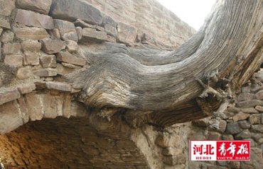 赞皇县城南约10公里处,有座僻静却极有名气的千年古村——尹庄。尹庄东南侧村口旁,有棵长了据说一千多年的古树。这棵古树的神奇在于它并不是直接长在地上,而是从一座古石桥的桥拱上钻出来,存活至今。桥拱离地一米多高,但是桥拱上的石块却没有明显被挤压的痕迹。