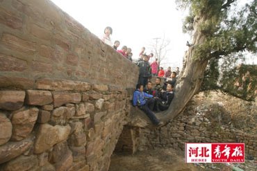 “好多人专门从北京赶来看呢。”崔占小说,长着古树的石桥叫做凤凰桥,祖祖辈辈传说,桥是隋朝时候建的,距今已一千三百多年。“我爷爷的爷爷小时候,古树就已有近3米粗了。”郭建朝表示,古树为侧柏,至少已成活1100多年。