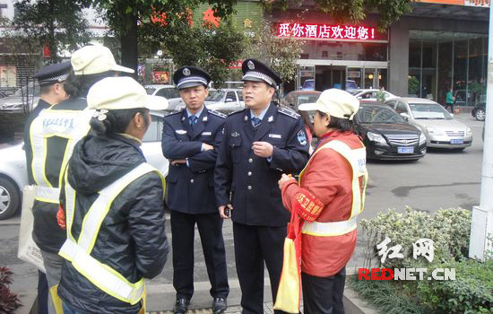 (株洲市城管执法支队支队长晏东方(右)、副支队长曾发云等检查文明用语月活动开展情况)
