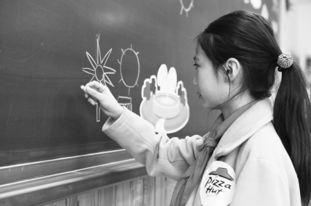 随后,大学生带领小学生在黑板上描绘出了“未来绿色社区”的蓝图(上图)。