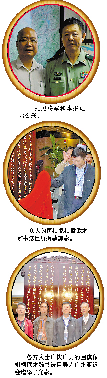 在广州亚运会开幕前,围棋象棋楹联木雕书法巨屏送到了广州棋院,安置在中国棋文化精粹馆,各路人马为其揭幕剪彩。围棋与象棋携手首次进入广州亚运会成为正式比赛项目,各方人士出钱出力的围棋象棋楹联木雕书法巨屏为广州亚运会增添了光彩,并且在中国棋文化史上留下了一件难得的佳作。孔将军开心地说:“这事干得漂亮!”