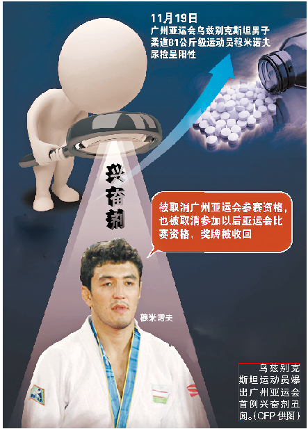 11月19日,亚组委召开新闻发布会,通报亚运男子柔道81公斤级银牌得主、乌兹别克斯坦选手穆米诺夫(Shokir Muminov)服用兴奋剂事件。据悉,此次被检出的药物甲基己胺属于刺激剂,这种类型的兴奋剂能对神经肌肉起直接的刺激兴奋作用,是最原始意义上的兴奋剂,也是最早使用并最早被禁用的一类兴奋剂。
