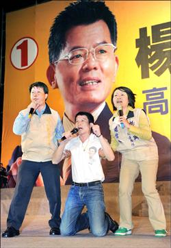 前高雄市长苏南成、尹清枫胞妹尹星雯现身站台,为晚会带来第一波高潮,接着艺人秦扬上台下跪磕头,请大家为高雄子弟未来一定要投杨,现场气氛一度相当悲情。