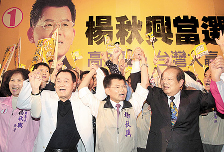拼场▲杨秋兴(右2)20日在高雄县举行造势晚会,苏南成(右)、高雄市各省同乡会总会长李厚业(左2)上台高喊当选。