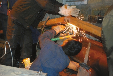 晚上7:55,由于积水过多,矿井水位并没有发生明显变化。事故现场矿井井口的工人正在焊接新的抽水钢管,以扩大抽水作业进度。