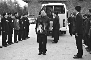灵堂外,上千名从各地赶来的人们,在风中排队等候送别范先生。其中不少人手中拿着白色菊花,还有人拿着范敬宜生前最喜欢的那张仰头大笑的照片。