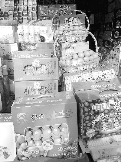 在西关某大型超市,记者看到一种渭源县某农场生产的“土鸡蛋”,促销员推荐说这种鸡蛋都是散养在山坡上的鸡下的,一盒40元大概有6斤,比普通鸡蛋贵一点,但非常适合孩子、老人、病人食用。随后记者又来到省人民医院、兰医二院门口,看到这里有七八个摊点和小商店都摆放着“土鸡蛋”销售,品种既有“正大宝贝蛋”这样的品牌鸡蛋,还有四五种无厂名、厂址的三无产品。这些鸡蛋包装不同,价格也相差很大,从三十多元到四十多元不等。摊主向记者推荐说,这些“土鸡蛋”都是榆中、西固的厂家送来的,特别适合作为礼品赠送给亲人,看望病人,既大方又不贵,现在买的人很多。
