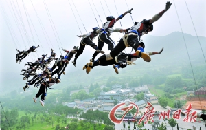 为了方便训练,导演组专门在塔沟武校老校区建了一个1∶1的训练架,高40米。并从全校近3万名学生中选拔180人。“‘起步价’就是30米,如果这个高度就害怕,那上了78米肯定没戏。很多学员上了40米的架子,从威亚架上往下跳,就直呕吐,还有人吓得尿裤子。”该项目负责人郭振举说,“一个空中演员,需要七个人在幕后拉钢丝。180名空中飞人,全靠地面上1400多人的拉动。演员的生命安全都攥在地面人员的手中。”郭振举说,每天要跑20公里左右,一练就是八九个小时。有两名学员鼻子和下巴被撞裂,缝了十几针。