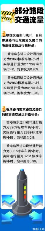 记者了解到,以香港路周边地区为例,山东路、东海路、南京路等沿海路段,以及黑龙江路与海尔路相交段等公路断面,目前的车辆通过量已经达到甚至超过饱和。此外,高峰时段行人交通流量也已经接近饱和,个别路段行人交通流量已超过其通行能力。