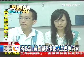 环球网11月24日消息,台湾深绿组织“南社”昨日上午到陈致中竞选总部表达力挺,陈致中夫妇在谈起龙潭案判决,以及检察官认定陈致中召妓时,表示“相当愤慨”,黄睿靓说到难过的地方居然还把扁家人的官司,和“杨淑君事件”相提并论,称双方都是“受到冤屈”。黄睿靓将体育事件与扁家弊案扯上关系,对此,国民党秘书长金溥聪说,“不要把政治选举带到体育里面来”。