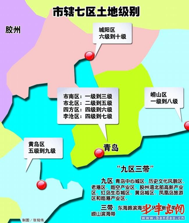 记者注意到,根据新的土地级别体系,市辖七区的土地级别差异非常明显。市南区的土地级别为一级到三级;市北区的土地级别为二级到五级;四方区的土地级别为四级到六级;李沧区的土地级别为四级到七级;崂山区的土地级别为一级到八级;城阳区的土地级别为六级到十级;黄岛区的土地级别为五级到九级;青岛高新技术产业开发区的土地级别为八级到十级。