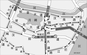●前往月湖桥、江汉二桥方向的机动车,可走江汉一桥下桥匝道—知音大道—龙灯堤路—琴台大道。