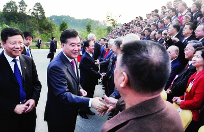 昨日下午,汪洋、肖扬、罗豪才、黄华华、黄龙云等与参加世客会的客属代表合影留念。