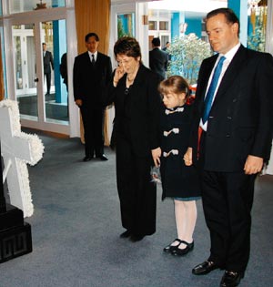 蒋经国长孙女蒋友梅(左)与夫婿(右)、女儿(中)到头寮吊念祖母蒋方良,难掩悲伤,不断拭泪。图片来源:台湾《联合报》