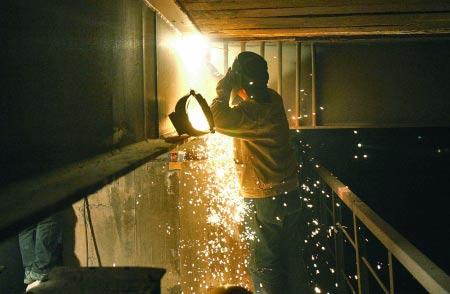 随后,工人用绳索将千斤顶、钢管、木板等一点点送到桥下。记者看到,工人们先用枕木、钢架、木板搭起3个立柱,起到对沉降钢梁的支撑作用,随后进行焊接。焊花闪烁,连接缝隙的三脚架被一点点焊接,施工紧张而忙碌……