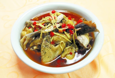 当然,醋还是黄米醋。吃东安鸡的醋,白醋无疑不带劲。鲜香肥嫩呢?无论有骨还是无骨,在这方面都不可少。只要这菜的名片是“东安鸡”,它就该是个“三好学生”——好鲜、好香、好嫩。米醋,好香;子鸡,好嫩;快杀,好鲜。东安鸡的另一个传闻正说明这个道理:话说当年行脚商人走到东安一家旅馆,老板娘准备打烊,店中无菜。急中生智,宰杀子鸡,锅内清煮,姜辣淋醋煸烧,一气呵成的速度造就了东安鸡的香辣鲜嫩。据说张小春在台湾曾经表演过1分半钟之内宰鸡、清洗一条龙“整鸡绝技”,这无疑有益于东安鸡的鲜嫩。