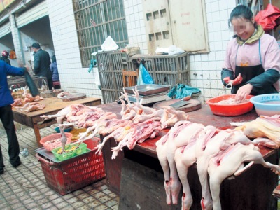 红星大市场家禽区,已经脱毛的鸡鸭显得白白净净的,被摆在摊位上叫卖。陈勇 周可 摄影报道