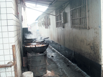 这里大约有几十家屠宰点,卫生环境恶劣,室内地板上污水横流,鸭毛粪便到处都是,一片狼藉,而已宰杀的光鸭就堆放在地上。虽然记者并没有发现正在用沥青拔毛的场面,但看到在几个屠宰点的门口都放着几口锅,里面装着沥青,锅体黑色还有余温。记者经过这些屠宰点的时候,引起了几个屠宰户的注意,他们齐刷刷地以异样的目光注视着“不速之客”。